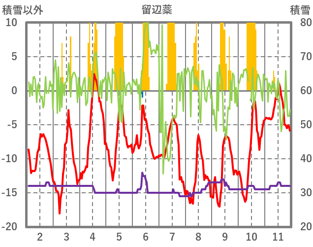 | 日 | 時 | 気温 | 降水 | 風向/風速 | 日照 | 積雪 | 降雪 |