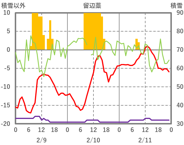 | 日 | 時 | 気温 | 降水 | 風向/風速 | 日照 | 積雪 | 降雪 |