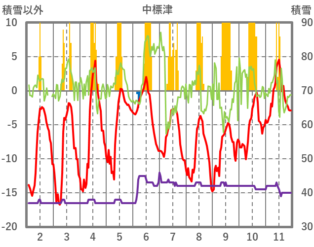 | 日 | 時 | 気温 | 降水 | 風向/風速 | 日照 | 積雪 | 降雪 |