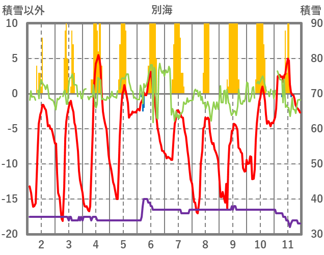 | 日 | 時 | 気温 | 降水 | 風向/風速 | 日照 | 積雪 | 降雪 |