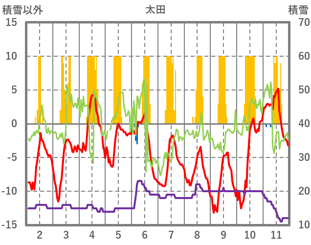 | 日 | 時 | 気温 | 降水 | 風向/風速 | 日照 | 積雪 | 降雪 |