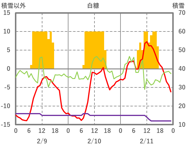 | 日 | 時 | 気温 | 降水 | 風向/風速 | 日照 | 積雪 | 降雪 |