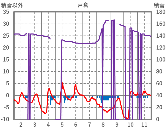 | 日 | 時 | 気温 | 降水 | 風向/風速 | 日照 | 積雪 | 降雪 |