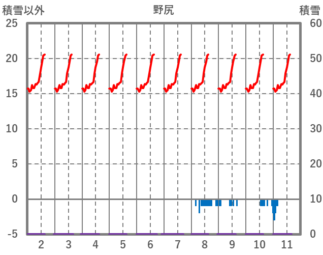 | 日 | 時 | 気温 | 降水 | 風向/風速 | 日照 | 積雪 | 降雪 |