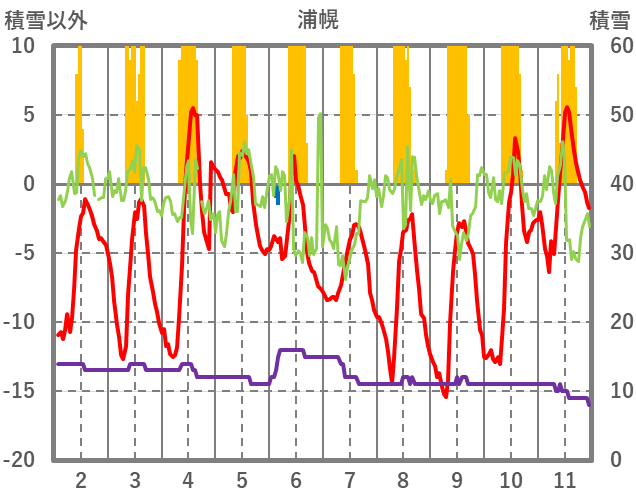 | 日 | 時 | 気温 | 降水 | 風向/風速 | 日照 | 積雪 | 降雪 |