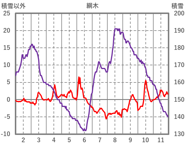 | 日 | 時 | 気温 | 降水 | 風向/風速 | 日照 | 積雪 | 降雪 |