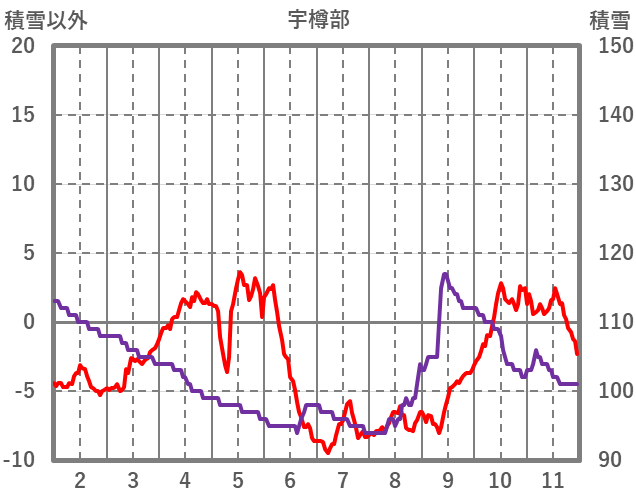 | 日 | 時 | 気温 | 降水 | 風向/風速 | 日照 | 積雪 | 降雪 |