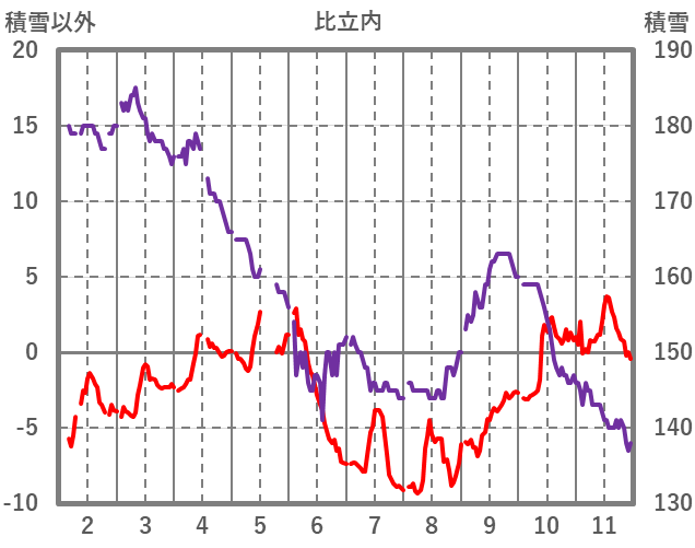 | 日 | 時 | 気温 | 降水 | 風向/風速 | 日照 | 積雪 | 降雪 |