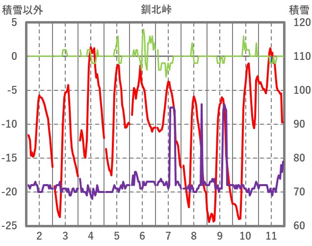 | 日 | 時 | 気温 | 降水 | 風向/風速 | 日照 | 積雪 | 降雪 |