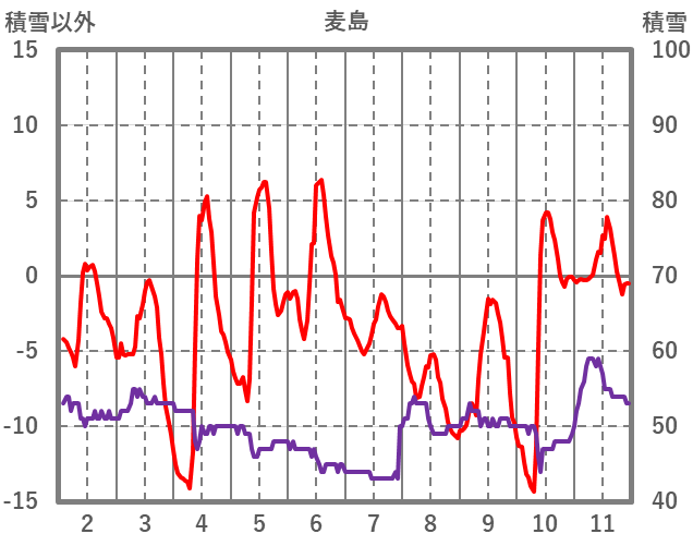 | 日 | 時 | 気温 | 降水 | 風向/風速 | 日照 | 積雪 | 降雪 |