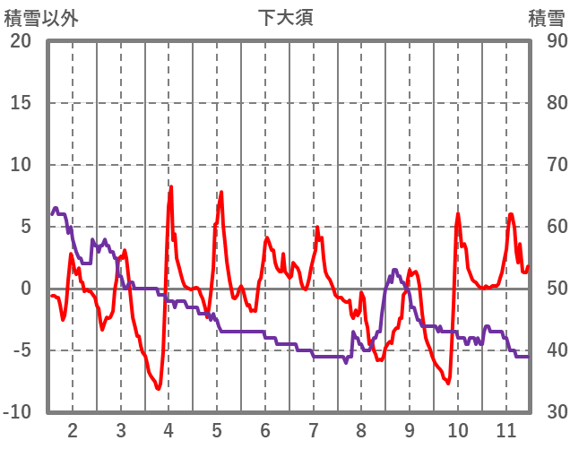 | 日 | 時 | 気温 | 降水 | 風向/風速 | 日照 | 積雪 | 降雪 |
