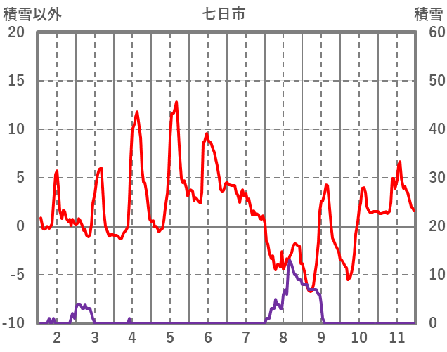 | 日 | 時 | 気温 | 降水 | 風向/風速 | 日照 | 積雪 | 降雪 |