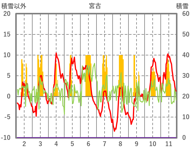 | 日 | 時 | 気温 | 降水 | 風向/風速 | 日照 | 積雪 | 降雪 |