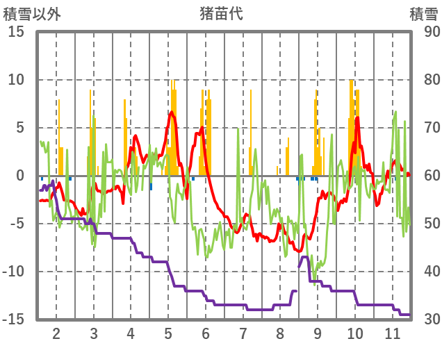 | 日 | 時 | 気温 | 降水 | 風向/風速 | 日照 | 積雪 | 降雪 |