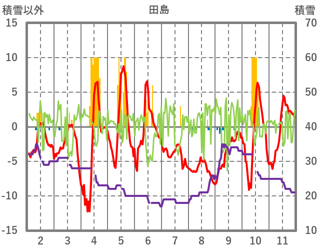| 日 | 時 | 気温 | 降水 | 風向/風速 | 日照 | 積雪 | 降雪 |