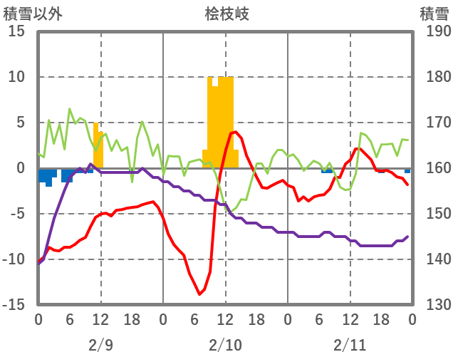 | 日 | 時 | 気温 | 降水 | 風向/風速 | 日照 | 積雪 | 降雪 |