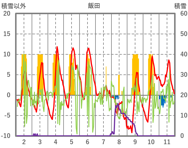 | 日 | 時 | 気温 | 降水 | 風向/風速 | 日照 | 積雪 | 降雪 |