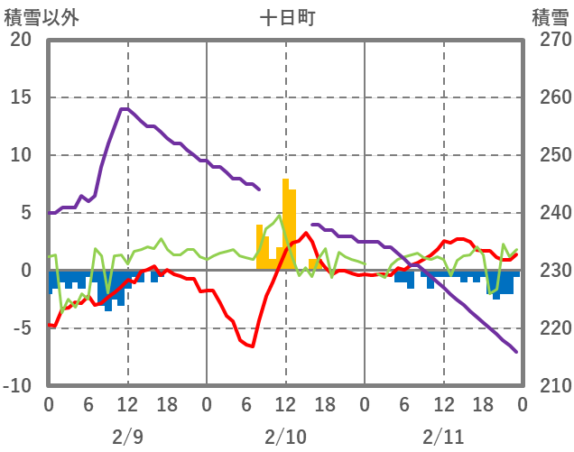 | 日 | 時 | 気温 | 降水 | 風向/風速 | 日照 | 積雪 | 降雪 |