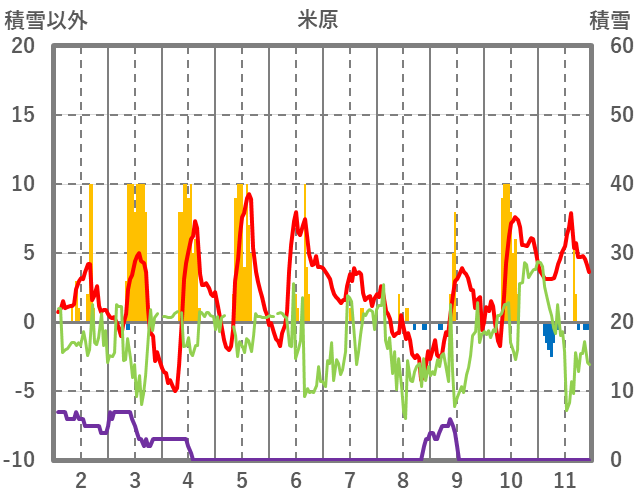 | 日 | 時 | 気温 | 降水 | 風向/風速 | 日照 | 積雪 | 降雪 |