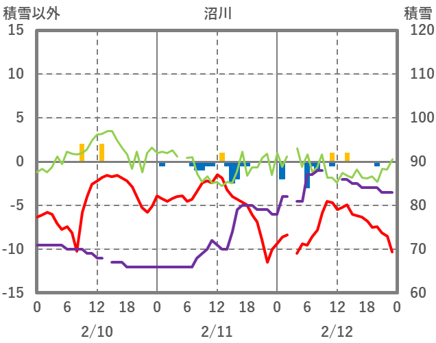 | 日 | 時 | 気温 | 降水 | 風向/風速 | 日照 | 積雪 | 降雪 |