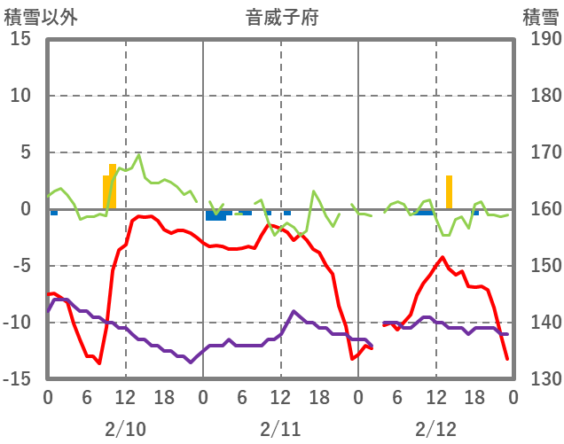 | 日 | 時 | 気温 | 降水 | 風向/風速 | 日照 | 積雪 | 降雪 |