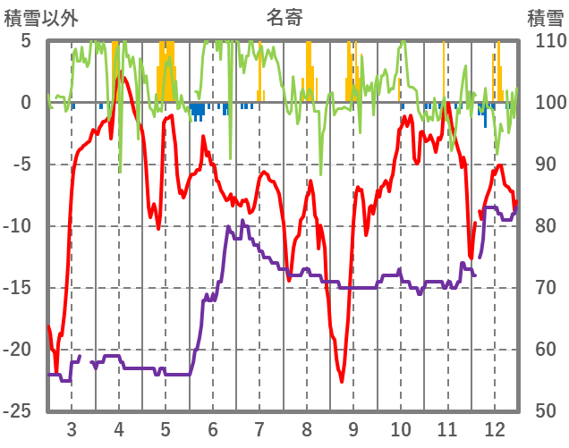 | 日 | 時 | 気温 | 降水 | 風向/風速 | 日照 | 積雪 | 降雪 |