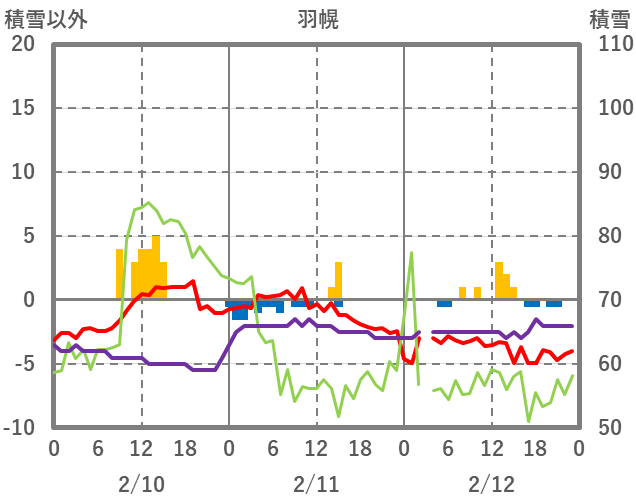 | 日 | 時 | 気温 | 降水 | 風向/風速 | 日照 | 積雪 | 降雪 |