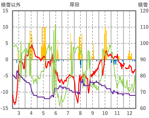 | 日 | 時 | 気温 | 降水 | 風向/風速 | 日照 | 積雪 | 降雪 |