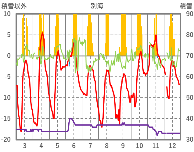 | 日 | 時 | 気温 | 降水 | 風向/風速 | 日照 | 積雪 | 降雪 |