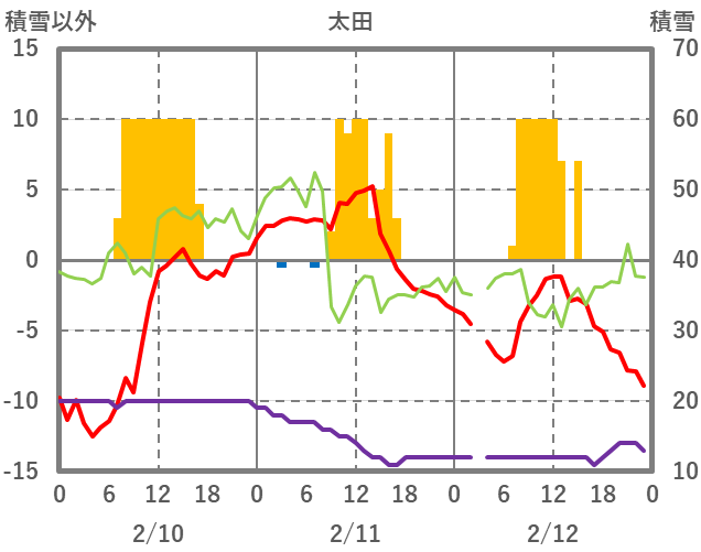 | 日 | 時 | 気温 | 降水 | 風向/風速 | 日照 | 積雪 | 降雪 |