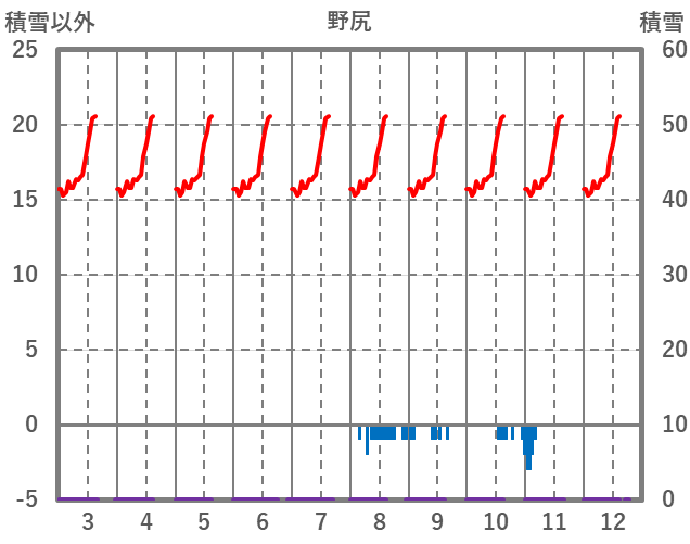| 日 | 時 | 気温 | 降水 | 風向/風速 | 日照 | 積雪 | 降雪 |