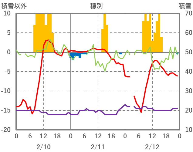 | 日 | 時 | 気温 | 降水 | 風向/風速 | 日照 | 積雪 | 降雪 |