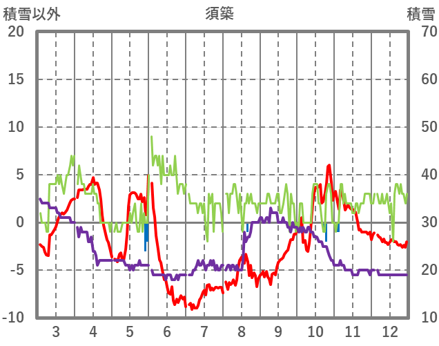 | 日 | 時 | 気温 | 降水 | 風向/風速 | 日照 | 積雪 | 降雪 |