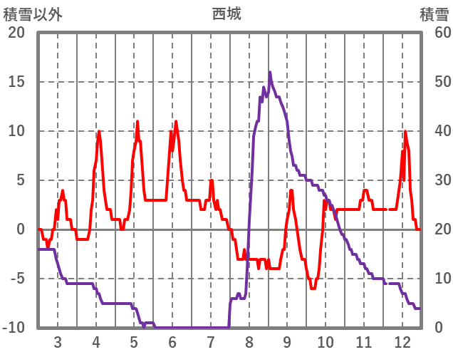 | 日 | 時 | 気温 | 降水 | 風向/風速 | 日照 | 積雪 | 降雪 |