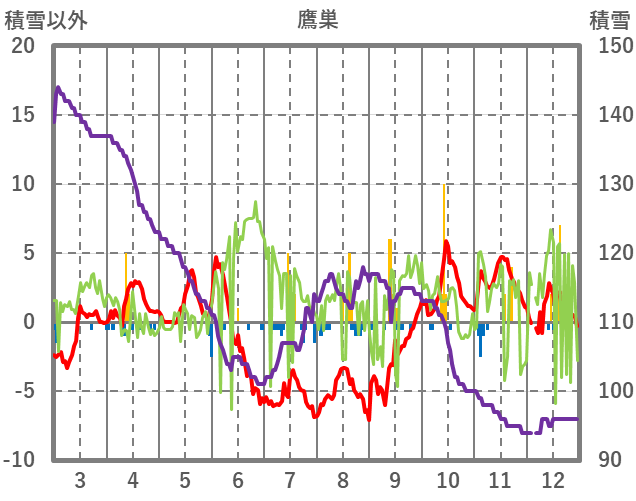 | 日 | 時 | 気温 | 降水 | 風向/風速 | 日照 | 積雪 | 降雪 |