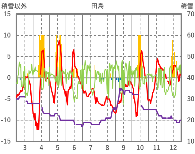 | 日 | 時 | 気温 | 降水 | 風向/風速 | 日照 | 積雪 | 降雪 |