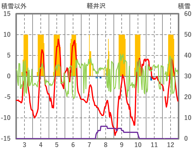| 日 | 時 | 気温 | 降水 | 風向/風速 | 日照 | 積雪 | 降雪 |