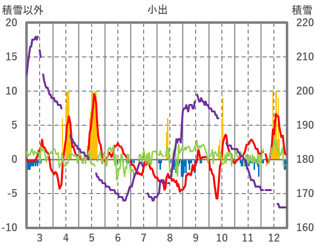 | 日 | 時 | 気温 | 降水 | 風向/風速 | 日照 | 積雪 | 降雪 |