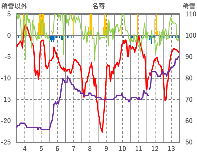 | 日 | 時 | 気温 | 降水 | 風向/風速 | 日照 | 積雪 | 降雪 |