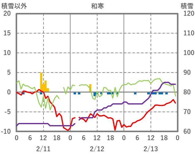 | 日 | 時 | 気温 | 降水 | 風向/風速 | 日照 | 積雪 | 降雪 |