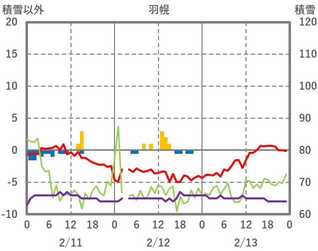 | 日 | 時 | 気温 | 降水 | 風向/風速 | 日照 | 積雪 | 降雪 |