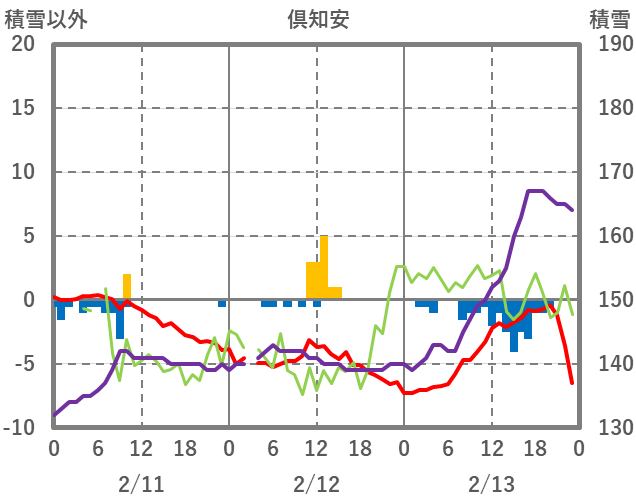 | 日 | 時 | 気温 | 降水 | 風向/風速 | 日照 | 積雪 | 降雪 |