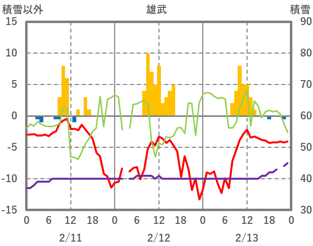 | 日 | 時 | 気温 | 降水 | 風向/風速 | 日照 | 積雪 | 降雪 |