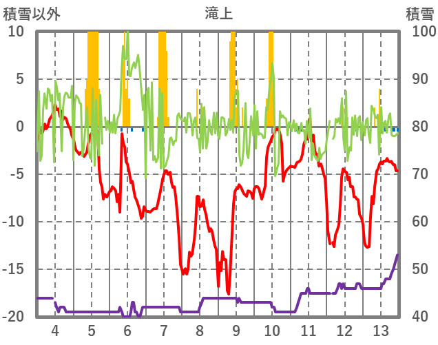 | 日 | 時 | 気温 | 降水 | 風向/風速 | 日照 | 積雪 | 降雪 |