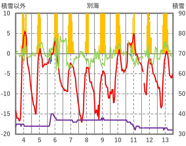 | 日 | 時 | 気温 | 降水 | 風向/風速 | 日照 | 積雪 | 降雪 |