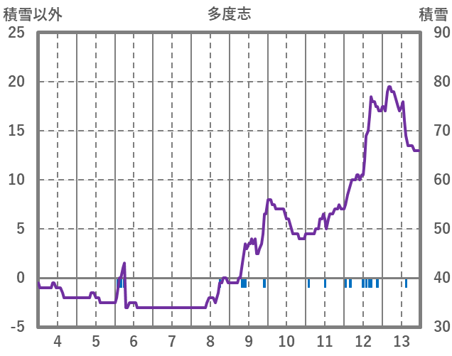 | 日 | 時 | 気温 | 降水 | 風向/風速 | 日照 | 積雪 | 降雪 |