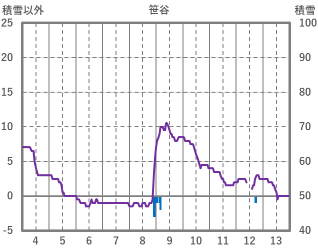| 日 | 時 | 気温 | 降水 | 風向/風速 | 日照 | 積雪 | 降雪 |