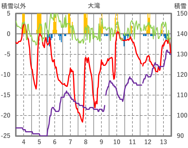 | 日 | 時 | 気温 | 降水 | 風向/風速 | 日照 | 積雪 | 降雪 |