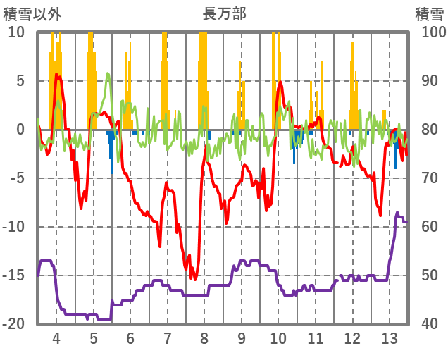 | 日 | 時 | 気温 | 降水 | 風向/風速 | 日照 | 積雪 | 降雪 |