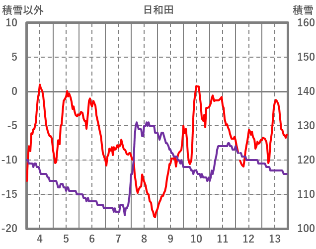 | 日 | 時 | 気温 | 降水 | 風向/風速 | 日照 | 積雪 | 降雪 |